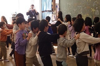 楽しいすごろくの後はみんなでじゃんけん電車をしました。1年生が幼稚園の子どもたちをリードし、賑やかな音楽に合わせて電車がどんどん長くつながっていきました。