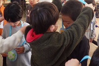 [画像]仲良しのプレゼント(33.7 KB) 最後には、1年生から幼稚園生へ手作りのメダルのプレゼントが贈られました。複雑に折紙で折られた綺麗なメダルに、子どもたちはとても喜んでいました。