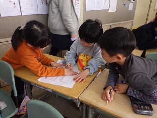 [画像]お勉強体験(34.3 KB) 学校につくと、1年生が優しく迎えいれ、まずはじめに小学校の勉強体験をしました。名前の書き方を教えてくれたり、音読を聞かせてくれたりして小学校の授業を体験することができました。