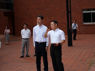 令和7年8月19日(火曜日)、南流山中学校で熊谷俊人千葉県知事による現地視察、野田市役所で熊谷知事と井崎市長並びに鈴木有野田市長との意見交換が行われました。