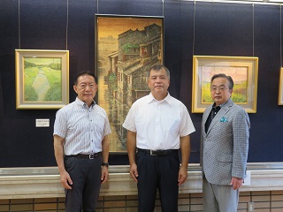 [画像]市民ギャラリー 後藤紳也日本画展の様子3(45.8KB) 後藤紳也さんからは、「流山市では2回目の展示の機会となりました。今回も自分の作品の中からどのような展示にするか、考慮して作品を選定してきました。『蘇州水路』という中国の街の風景を描いた作品を中心に据え、市役所にいらっしゃる方の印象に残るよう、バランスを考えて配置しています。」とお話がありました。