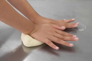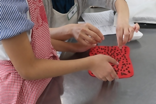 [画像]親子パン作り教室(72.9KB)次に、発酵させた赤い生地を麺棒で四角くします。丸い生地を四角くするのはなかなか難しい作業でした。四角くなった赤い生地に、溶けにくいチョコチップを乗せてスイカの種にしました。