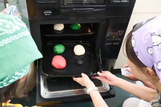 令和7年8月3日(日曜日)、初石公民館で「親子パン作り教室」が開催されました。講師に料理研究家・長久保聡美さんを迎え、7組16人の親子が参加しスイカパンを作りました。まず、材料を正確に測って調理台の上でこねます。始めは調理台や手にくっついてこねるのが難しいようでしたが、徐々に生地はふわふわで柔らかくなりました。