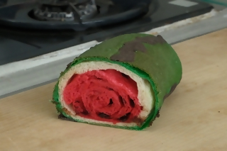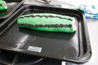 [画像]親子パン作り教室(69.5KB)チョコチップを入れた赤い生地をくるくる巻いて棒状にし、白い生地と緑の生地もあわせて巻いて海苔巻きの形を作ります。そして、細くした焦げ茶色の生地でスイカの表面模様を作り貼り付けました。最後に、30分程度二次発酵させて、180℃に予熱したオーブンに入れて焼き上げました。