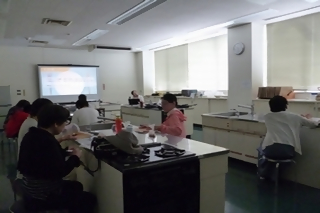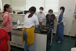 [画像]ヘルシーライフ講座(69.3KB)次に、講師が調理室でハンバーグを3種類焼き、ケチャップ、ウスターソース、ニンニクで作ったソースを絡めると、おいしそうな匂いが調理室に立ち込めました。調理する間も、受講者たちの質問に講師が丁寧に答え、受講者は真剣に聞いていました。