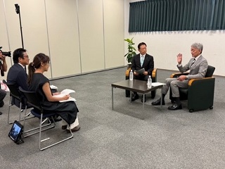 令和7年7月29日(火曜日)、流山おおたかの森S・Cで、井崎市長と東神開発株式会社の倉本真祐社長による対談が行われました。東神開発株式会社は、流山おおたかの森S・Cの管理運営を行うディベロッパーで、同S・Cがまちとともに発展してきたまちづくりの象徴的事例であるとして、親会社である高島屋グループの統合報告書に掲載するため対談が行われたものです。