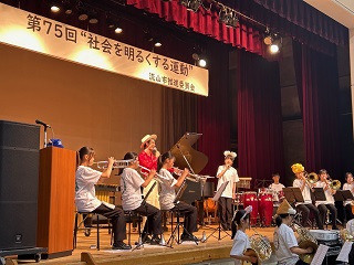 ジョイントコンサートは2曲で、1曲目の「君はともだち」は常盤松中学校吹奏楽部が演奏し、ダイヤ・ピアノ・サンタさんがボーカルで歌いました。2曲目の「ホール・ニュー・ワールド」では、常盤松中学校吹奏楽部の生徒とダイヤ・ピアノ・サンタさんがデュエットで歌い、来場者を魅了しました。満席の会場で大盛況で、コンサートを通して社会を明るくする運動への理解が深められた一日となりました。