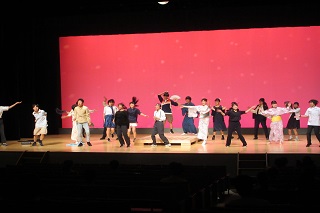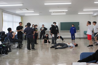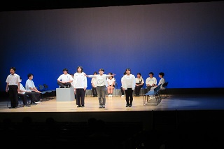 [画像]習作発表会の様子(33.1KB)A班は「見よう見まねで「ワレワレのモロモロ」をやってみた」、B班は「あの子と空を見上げる」、C班は「蝿」を上演しました。本番ギリギリまで努力する姿に感動しました。受講生からは、「他校生徒との交流の機会ができてよかった。」「演技にも磨きがかかった。」「とても勉強になった。」などの感想をいただきました。今回のワークショップの成果発表の場として、10月11日(土曜日)、12日(日曜日)に文化会館で千葉県高校演劇第一地区秋季発表会が開催される予定です。