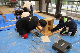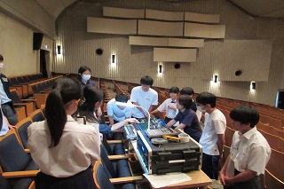 [画像]大道具班が制作する様子(61.3KB)舞台監督・大道具班は、ホールスタッフが講師となり綱元操作やロープワークを学びました。また、演劇部顧問の先生が講師となり、ホワイエにて三段ボックス作りました。インパクトドライバーやカンナなど初めて手にする道具に悪戦苦闘しながら製作し、出来上がった三段ボックスを前に歓喜する姿が印象的でした。照明班は、舞台照明のお仕事をされている八幡真由美さんとホールスタッフより、照明設備の名称や仕込み図の見方、明かりづくり、調光卓の使い方などを学びました。