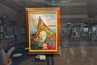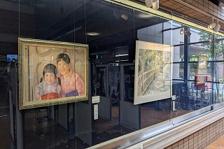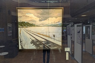 今月の展示は、流山市議会議長賞「お祭りにいくよ〜」(油彩画・佐久間静志さん)、流山市教育長賞「小径 柏の葉公園」(水彩画・齊藤重幸さん)、流山市美術家協会奨励賞「スイス アルプス」(油彩画・田川智津子さん)、会員奨励賞「雪雲走る七尾線(能登)」(水彩画・前田敬さん)、審査員「彫金 透し彫り クワズイモ」(彫金・俊晶子さん)、審査員「祝旗」(油絵・塚田千枝)の6作品が展示されています。