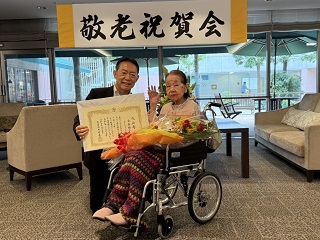 令和6年9月15日(月・祝日)、敬老の日に合わせ、井崎市長が市内の最高齢者を訪問し、お祝いしました。昨年に引き続き、市内の最高齢者は金森梅子さんです。金森さんは、大正7年生まれの満107歳。当日は、市長からお祝いの賞状と花束を手渡しました。市長が大正時代を経験された最高長寿のお祝いの言葉と激動の時代を過ごされたことへの敬意を伝えると、金森さんはすてきな笑顔を見せてくれました。また、写真撮影には力強く手を挙げて応じてくれました。