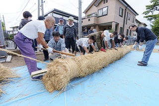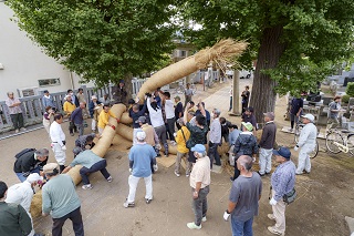 完成した大しめ縄は、重さ約500キログラムにも及ぶ勇壮な姿。化粧縄で飾り付け、花結びといわれる結び方で3つの「獅子頭」を作ってできあがりです。筆頭総代の山崎さんは「朝から多くの方に参加いただき、無事作り上げることができました。最近はこの大しめ縄を見るために県内だけでなく、県外からも見に来られる方もたくさんいらっしゃいます。これも地域の皆さんのご協力のおかげです。ありがとうございました」と話し、行事を締めくくりました。赤城神社では、18日(土曜日)に宵宮、19日(日曜日)に本祭が行われます。赤城神社の本殿に向かう38段の急階段を神輿が一気に駆け上がる勇壮な姿を、ぜひご覧ください。