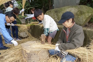 [画像]3本の縄を締め上げる(87.3 KB) 作業は朝8時から開始され、赤城神社に集まった各自治会の皆さんは、3班に分かれて大縄を作り始めました。縦に4つに割った竹を芯として、わらと縄を巻き付けて1本約150キログラム以上の重さの大繩にしていきます。