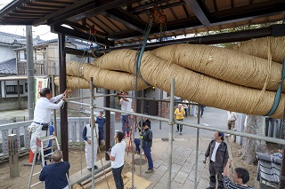 令和7年10月12日(日曜日)、流山6丁目の赤城神社で、市無形民俗文化財に指定されている大しめ縄行事が行われました。この行事は、不浄なものをさえぎるといわれる大しめ縄を1年ごとに新しく作り替え、神社入口に掲げるものです。流山5丁目から8丁目までの4自治会の皆さんと赤城神社の氏子(山崎政治筆頭総代)によって、毎年10月10日に近い日曜日に行われています。