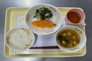 [画像]10月16日の給食(26.8 KB)そして、待ちに待った給食の時間です。「おいしい!」「全部食べたよ!」という声が次々上がり、野菜が苦手なこどももぺろりと食べていました。