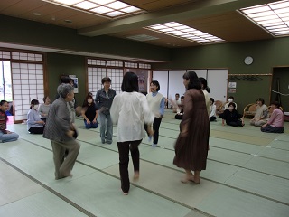 講演では、講師が歌うわらべうたに合わせて、参加者も会場中を動き回ってわらべうたを体験しました。また、わらべうたを行う時のコツ、「リズム感」や「音階」が子どもの成長段階に寄り添っていることを自身の経験談を交えて語られました。