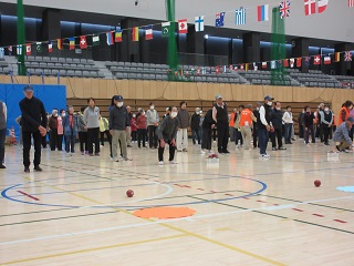 午前の部では、個人競技である片足立ち競技とボッチャ、団体競技のボール入れゲーム、午後の部では個人競技の輪投げゲーム、パン食い競争、運試し、団体競技の玉入れが行われました。
