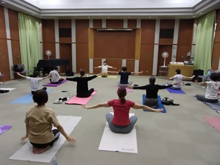 最後はゆったり寝転がってストレッチを行った後、照明が消され、仰向けで目を閉じ、約3分間のシャバーサナ(ヨガのポーズ名)に入りました。全身の力を抜いて安らいだ後、楽な姿勢で座って、さらに1分間の瞑想をして、講座終了となりました。