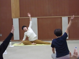 まずは、上半身や足腰のストレッチから始まりました。呼吸を意識しながら、伸ばす、縮める、ひねるなど、ゆっくり丁寧にほぐしていきました。