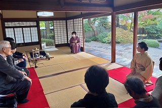 1席目には8名が参加しました。「おくみどり」という甘味や旨味の強さが特徴の茶葉を使ったお茶と、紅葉をモチーフにしたお菓子がふるまわれました。美しい庭を眺めながらいただくお茶とお菓子に、参加者は口々に「深みがあって美味しい」「お菓子を食べる前の一煎目と、食べた後にいただく二煎目では風味が違って、大変味わい深いです」などと、ゆったりとしたひとときを過ごしました。