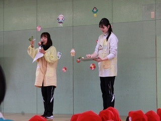 令和8年1月7日、江戸川台保育所で「お正月の集会」が行われました。集会は、3〜5歳児クラス、幼児教育支援センター付属幼稚園の5歳児クラスが集まり、にぎやかにはじまりました。