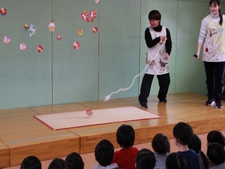 次は、お正月のあそびの紹介です。福笑い、羽根つき、お手玉・・・なかでも子どもたちが興味をもっていたのがコマ回しです。コマが板の上で回りはじめると「うわぁ」と声が上がりました。お手玉紹介の間も回り続け、最後には「すごいね」と拍手喝采でした。