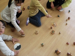 [画像]コマ回し(27.9 KB) いよいよあそびの時間です。どれにしようかな?と、一人ひとりが好きなあそびをみつけて楽しんでいました。