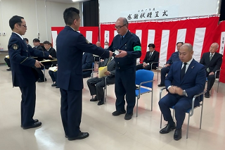 流山警察署長から流山市民安全パトロール隊長へ感謝状が贈られ、日ごろの防犯パトロール活動への労いと、犯罪抑止に多大な貢献をされていることへの感謝の言葉が贈られました。