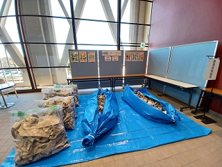 また、ホワイエの体験コーナーには、ブルーシートと新聞紙で作った寝袋と、ポリ袋と新聞紙で作った即席防寒具を用意し、参加者に自由に体験してもらいました。