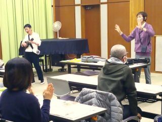 後半は2グループに分かれて、講師が紹介した英語絵本の読み聞かせの練習と発表を行いました。前半で学んだことを実践し、意見も活発に出し合いながら、笑顔あふれる練習となりました。発表ではお互いのグループを称賛する拍手が上がりました。最後に講座前と後でのイメージの変化などをプリントに書き込み、講座は終了となりました。