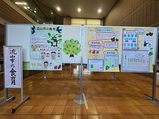 [画像]食育ポスター掲示(43.2 KB)その取り組みの一環として、「流山みんなのフレイル予防教室 管理栄養士による健康教育」「調理のデモンストレーション」「流山市食事力アッププログラム」「親子でわくわくクッキング」「流山産の小松菜をもっと知ろう」「保育所の給食 流山市産の野菜・果物」「シャインマスカットができるまで」「学校給食を用いた食育取組 みりん」「公立保育所の給食」など、各種パネルを展示しています。