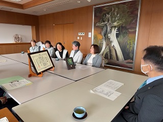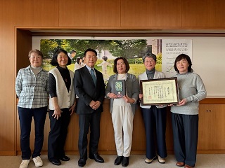 令和8年2月13日(金曜日)、令和7年度千葉県社会奉仕賞を受賞したおはなしくれよんが受賞の喜びを井崎市長に報告しました。同賞は、千葉県内において長年社会奉仕活動を行い、社会福祉の増進に顕著な功績のあった団体に贈られるもので、今回は3人と7団体が受賞しました。