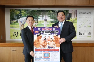 令和8年3月2日(月曜日)、同年8月25日(火曜日)にキッコーマン アリーナで開催予定の「令和8年度夏巡業 大相撲流山場所」について、公益財団法人日本相撲協会巡業部 枝川親方(元蒼樹山)が市長を表敬訪問しました。枝川親方は、今回の流山場所開催について「流山市での大相撲巡業は今回が初開催となるが、人口も増え、活気あふれる街で巡業を開催できることを非常にうれしく思う」と話しました。