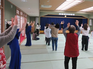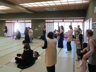 [画像]教えていただき、親子でフラに挑戦する様子(52.6 KB) その後は、参加者も一緒にフラに挑戦しました。「波」「花」「雨」「太陽」などのハンドモーションやステップを教えてもらいながら、親子でゆったりと体を動かしました。抱っこをしながら参加する方や、お子さんと一緒に手をつないで楽しむ方など、それぞれのペースでフラの時間を楽しんでいました。参加者からは「初めて見ましたが、とても美しく癒されました。」「私もフラをやってみたくなってしまいました。」などの声がありました。