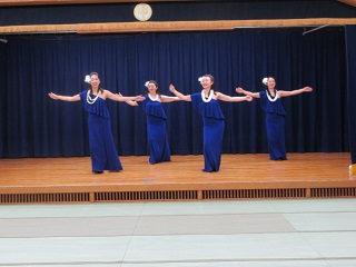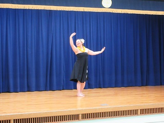 [画像]舞台でフラを披露するフラサークルの皆さん(43.8 KB)今回のミニイベントは、フラサークル・ラウアエの皆さんをお招きしました。まずは、ラウアエの皆さんによるフラの披露からスタートしました。ゆったりとしたハワイアンミュージックに合わせて踊る優雅なフラに、会場は一気に南国のような雰囲気に包まれました。参加していたお子さんも、きれいな衣装ややさしい動きに興味深々。保護者の方々も、間近で見るフラの美しさに見入っていました。