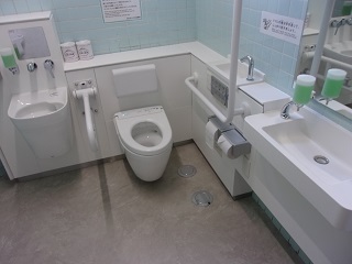 [画像]バリアフリートイレの様子(27.6 KB)また、2階・3階にあるバリアフリートイレにオストメイト対応トイレを新設し、リニューアルしました。手すりや洗面台の位置も変わり、より多くの方に安心してご利用いただけるようになりました。