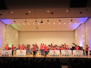 [画像]「カレーライス」のうたの様子(49.4 KB)開演の少し前から、フルートなどの管楽器によるオープニングパフォーマンスが行われました。早めに来場していた観客は楽しそうに耳を傾け、会場に向かう人たちも足取り軽くホールへ向かっていました。コンサートは手遊びうたのメドレーで始まりました。観客の皆さんも演奏に合わせて手を動かして盛り上がっていました。