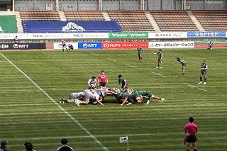 [画像]試合(40.5 KB)試合は、日本製鉄釜石シーウェイブスを相手に序盤からNECグリーンロケッツが圧倒的な攻勢を見せました。チーム一丸となった厚みのある攻撃で次々と得点を重ね、会場のボルテージは最高潮に。終始主導権を握り続けた選手たちは、ファンの熱い声援に応える力強いプレーを披露しました。結果は54対14でNECグリーンロケッツ東葛が見事な勝利を収めました。瞬時に変化する試合展開は見ごたえのあるシーンばかりで目の離せない好ゲームでした。