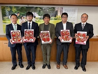 令和8年3月19日(木曜日)、市内のいちご農家で構成される「流山市いちご研究会」(中村和佑会長)は、いちごの最盛期を迎え、今年の出来栄えを報告するため市長室を訪問しました。この日、研究会の皆さんが持ってきてくださったいちごは、チーバベリー、紅ほっぺ、おいCベリー、あきひめ等の品種。丹精込めて育てられたいちごが運ばれてくると、箱の蓋を閉めていても隠せないくらいの甘い香りで満ち溢れました。