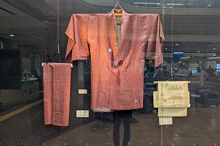 [画像]手工芸部作品展の様子(34.6 KB)和裁で雨コートを作製された阿部真弓さんは、「製作期間は1週間ほどになります。上下に分かれた着物の雨コートというのは、珍しいものかと思います。帯は「つくり帯」というハサミをいれず畳んでつくる手法の帯です。ぜひご覧ください」と話してくださいました。