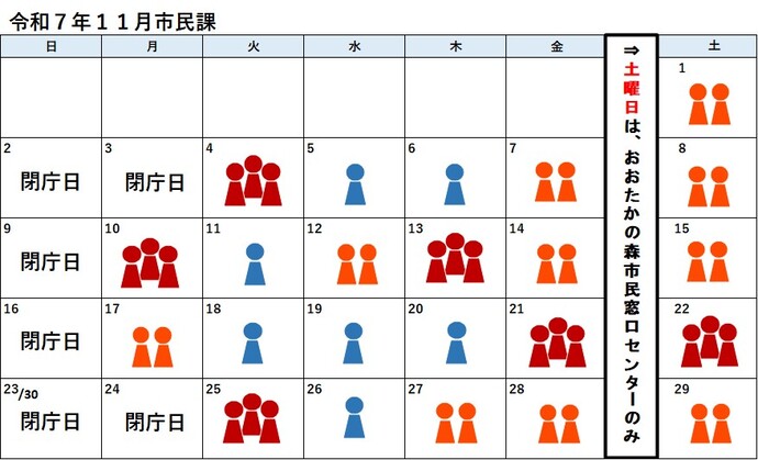 (平日の午後5時以降および土曜日は、戸籍の届出は他市区町村への照会ができないためお預かりとなります。また、海外からの転入、特例転入および住基カード・個人番号カードの継続利用の手続きはできません。その他の取り扱いのできない業務もございますので、事前にお問い合わせ下さい。)