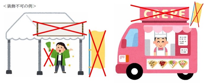 ブース内装飾は原則自由としますが、イベントの雰囲気を大切にしているため、のぼり(スタンド等を使用しテントから独立させたものや車体からポールを飛び出させたもの等)、ハッピ、およそ1mを超える、商品写真を全面に押し出すような車上の大型看板は禁止としています。また、ブースからのはみ出しを禁止しているため、キッチンカーの前に机を設置しての過度な調理などはお控えください。