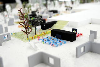 子どもたちは、小中学生が入り混じって2班に分かれ、PTAは1班に。まずは、設計者の株式会社シーラカンス アンド アソシエイツの担当者から、現在計画されている学校の設計概要について説明がありました。業者選定の際の公募型プロポーザルで提案された模型を前に説明を聞く子どもたちは、自分たちが通う学校とはかなりイメージの違うことに驚きながら、興味深そうに模型の細部まで確認していました。