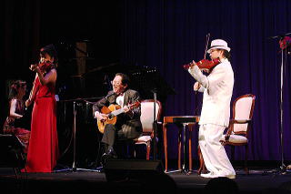 この日のコンサートは、休憩なしの3部構成。はなしまなおみさんとアントニオ斉藤さんのダブルヴァイオリンを中心とした1部と、アントニオ古賀さんのギターを中心にした2部、そして全員がそろっての3部へと続きます。懐かしの古賀メドレーでは、客席も一緒に「丘を越えて」、「酒は涙か溜息か」、「影を慕いて」、「東京ラプソディ」などを次々と合唱。最後は、東日本大震災の被災地復興を願って客席も立って手をつないで「見上げてごらん夜の星を」を大合唱しました。