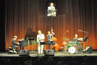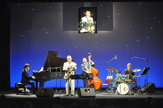 [画像]猪俣猛追悼ジャズライブ(34.6 KB) 第1部のステージではスーツ姿だった4人のジャズメンが、第2部では流山ジャズフェスティバルのポロシャツに着替えて登場。プログラム最後の曲『Take the A train』の演奏後、アンコールの声と拍手が鳴りやまず、4人のメンバーはステージで話し合い、八木さんのドラムから『Sing Sing Sing』のイントロが奏でられ会場が一気に盛り上がりました。ステージには猪俣猛さんの笑顔の写真が飾られ、猪俣さんに見守られるようにして迫力ある演奏が披露されました。