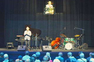 [画像]猪俣猛追悼ジャズライブ(30.0 KB)開演に先立ち、流山ジャズフェスティバルを主催してきた流山文化のまちづくり実行委員会の宮原哲也委員長が来場されたファンの皆さんに感謝を伝え、続いて井崎義治市長が生前、猪俣さんが流山の子どもたちに音楽の素晴らしさを伝え続けられた功績などを紹介しました。