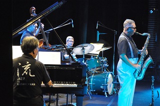 [画像]猪俣猛追悼ジャズライブ(26.8 KB)出演は八木秀樹(ドラム)、右近茂(テナーサックス、クラリネット)、青木弘武(ピアノ)、加藤真一(ベース)のカルテット。猪俣さんは飛鳥クルーズで右近さんや青木さん、加藤さんらと何か月も演奏をされたそうですが、その洋上で作曲された『サザンクロス』、『ラッコ』なども当日のステージで演奏しました。
