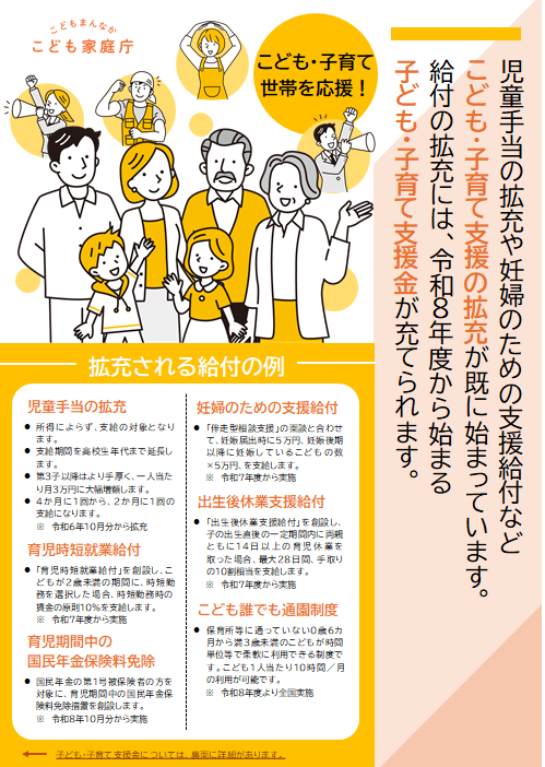 子ども・子育て支援金制度の概要等については以下のリーフレット及び、下記のリンクよりこども家庭庁ホームページをご参照ください。