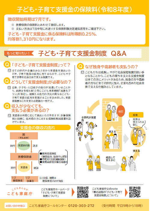 [画像]国リーフレット(139.6 KB)令和8年3月2日より、こども家庭庁において、子ども・子育て支援金制度に係るコールセンターを設置しています。子ども・子育て支援金制度に関するご質問は、下記までお問い合わせください。
