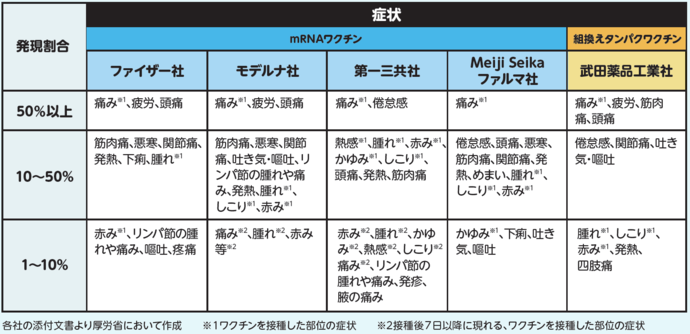 厚生労働省では、接種前後の抗体価の推移や、接種部位の腫れ・痛み、発熱、頭痛など接種後に起こりやすい様々な症状の頻度などを調査し、皆様にお知らせしています。
